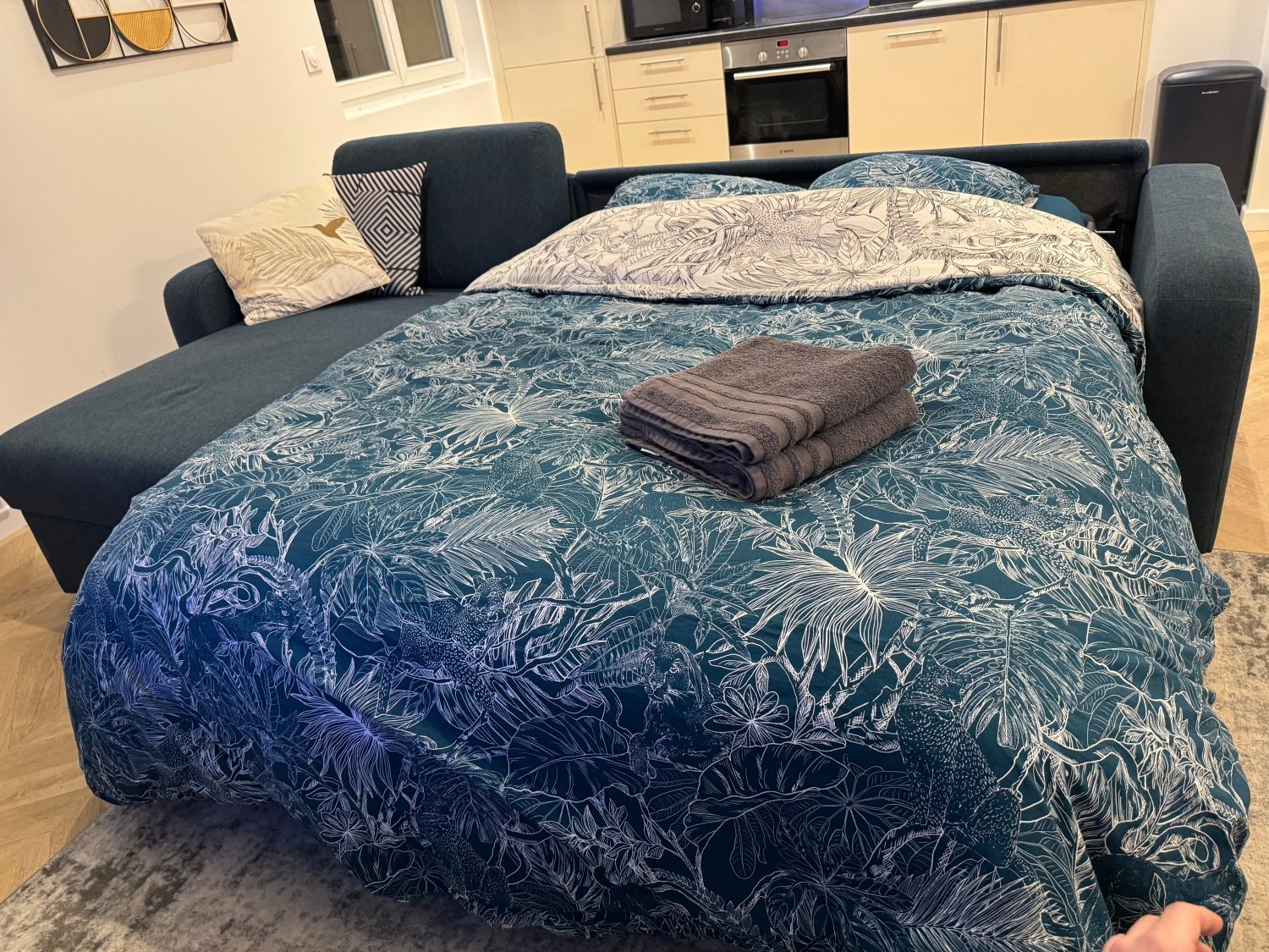 Équipements pratiques : lit parapluie, espace de travail dédié et Wi-Fi haut débit (657 Mbps).